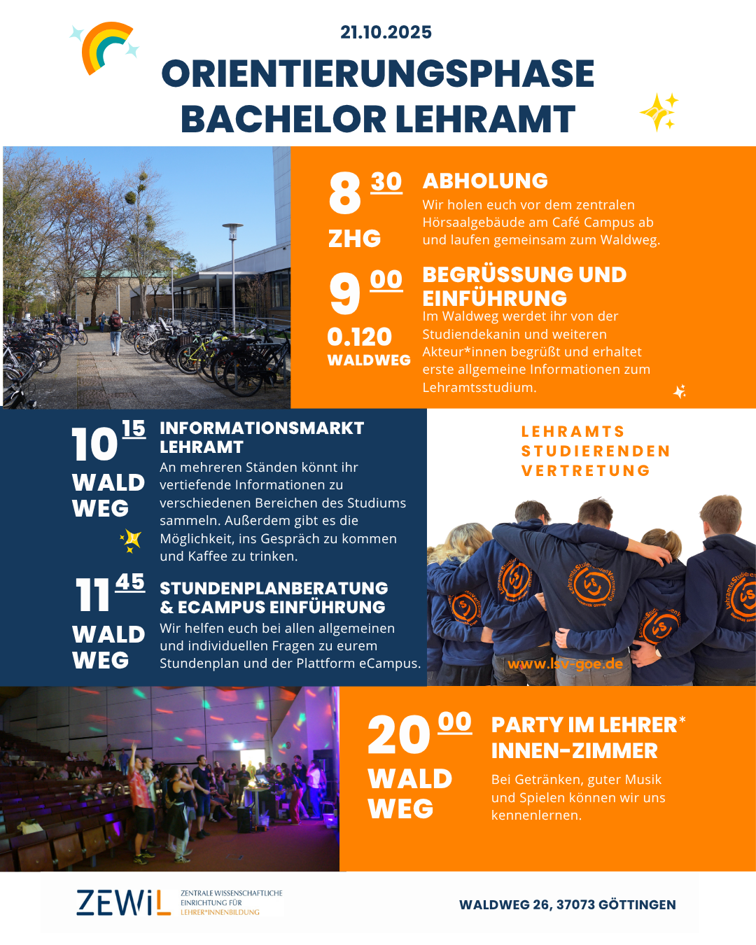 Wir begrüßen euch im Namen aller Lehramtsstudierenden und freuen uns schon, euch in der Lehramts-O-Phase kennenzulernen. Wie jedes Jahr organisieren wir dabei viele verschiedene Orientierungs- und Vernetzungsangebote für euch, damit ihr gut in Göttingen ankommt. Außerdem stehen wir euch als Fachschaft beratend zur Seite, wenn ihr Fragen zur O-Phase habt.